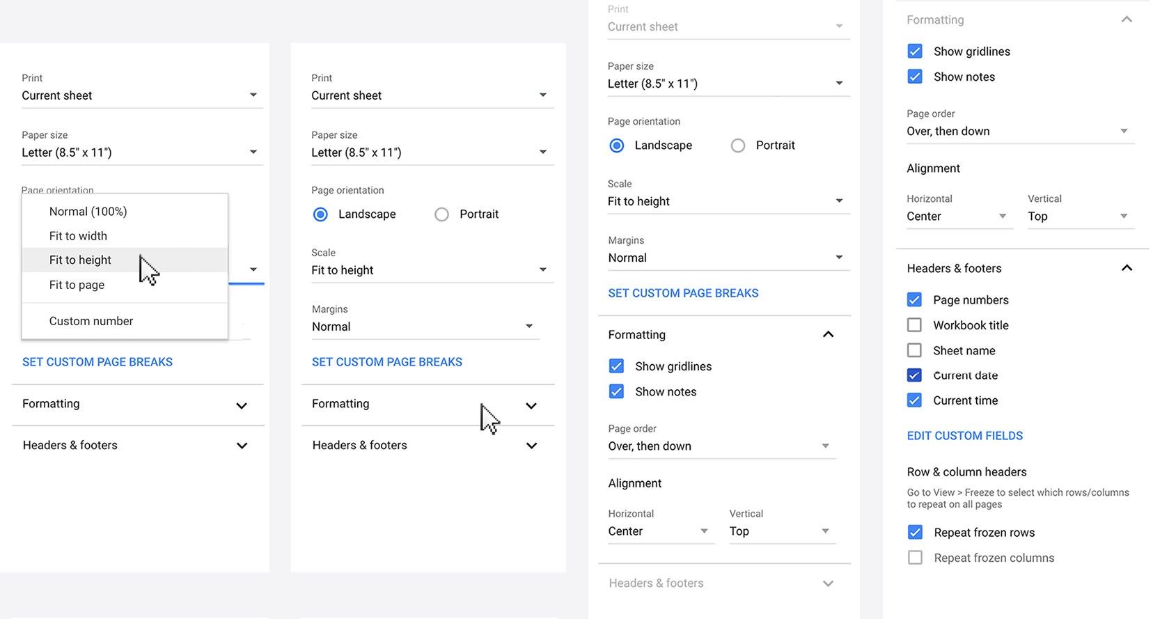 Scale and pagination are closely interconnected when printing spreadsheets. We prioritized fast scale options like “Fit to width” and “Fit to height” to focus information all in one place, but also enabled custom scale number input for when those options aren’t a good enough to meet user needs.