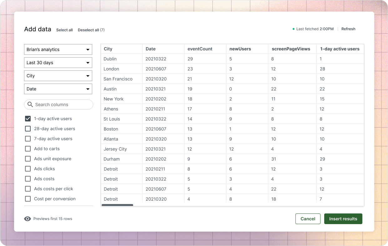 Select data columns to add to table. Preview to confirm structure and work with data load constraints before adding to document.